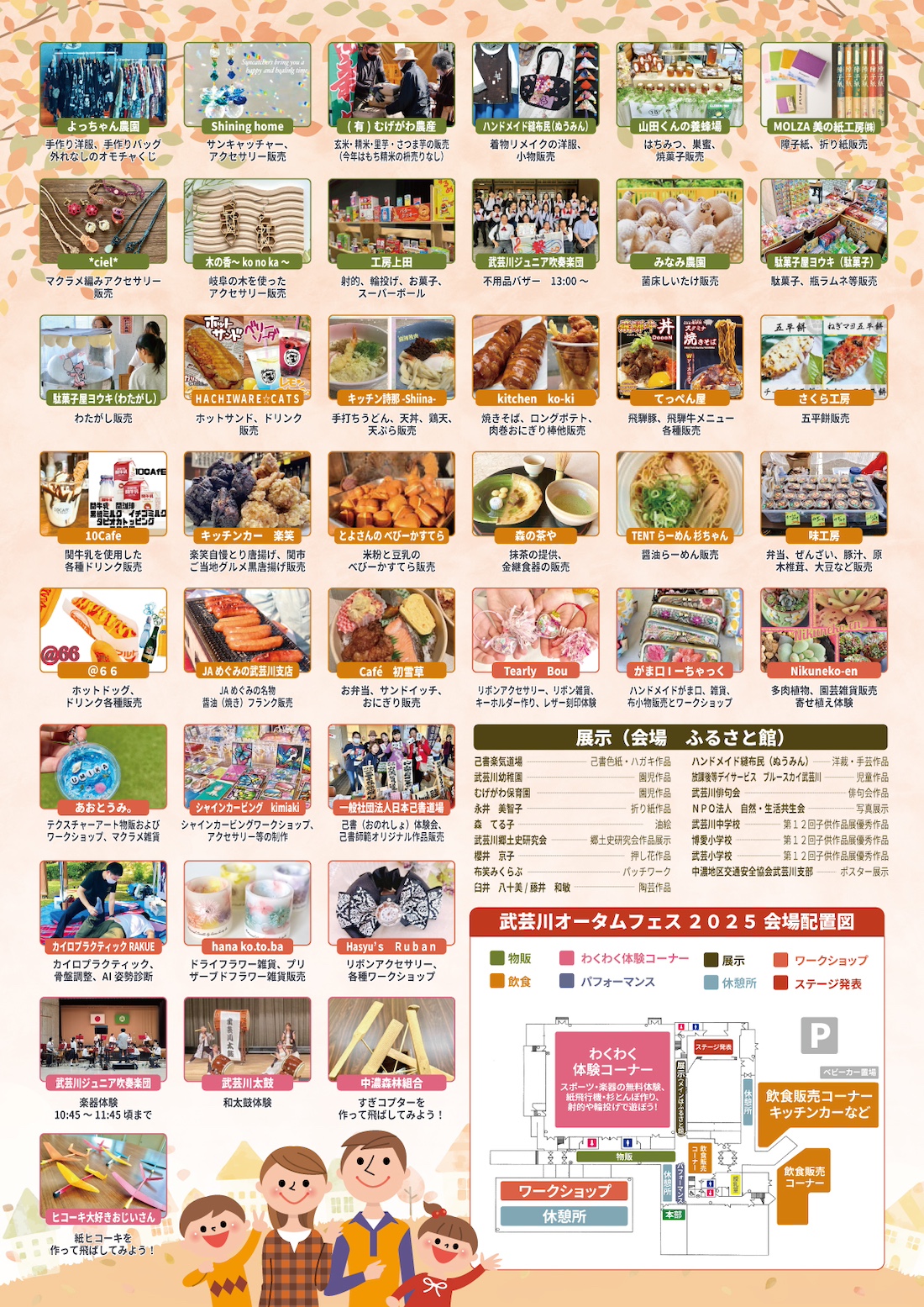 武芸川オータムフェス2025チラシ(裏面)武芸川オータムフェスは、毎年毎年「過去最大」を更新している感じですが、いったいどこまで進化を続けるのでしょうか!