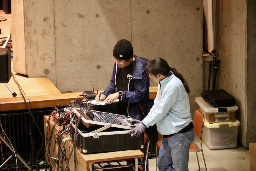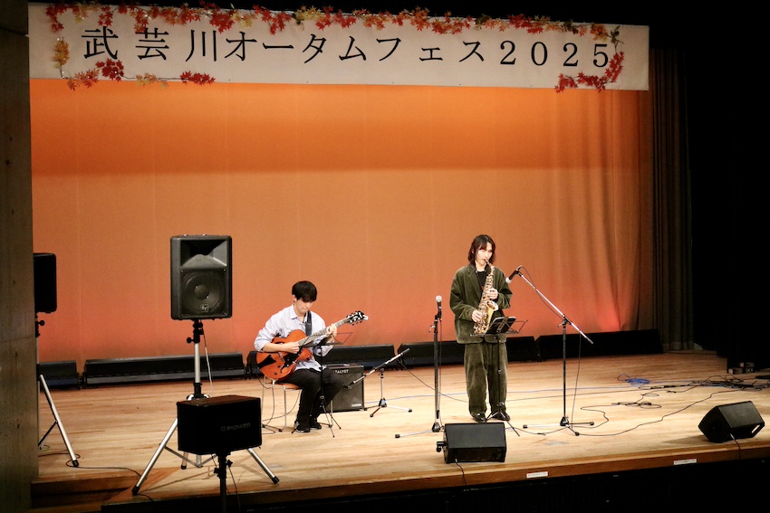「音響の人」ではなく、武芸川の有名人です!武芸川オータムフェス2025のステージの音響を支えてくださったのは、地元の名店「LIVE CAFE R50」からメジャーデビューを目指す五十川博さん(写真奥)と、プロギタリストの「志太郎‐yukitaro-さん(写真手前)」。